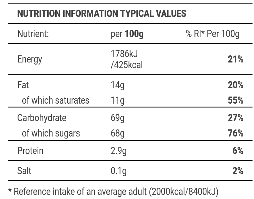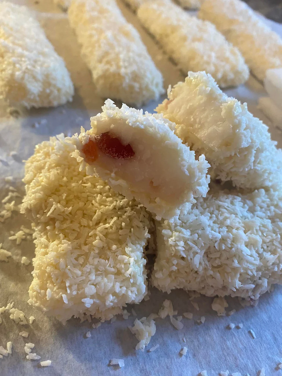 Ingredients: Fondant, Desiccated Coconut, Callebaut Chocolate [Sugar, Cocoa Butter, Whole Milk Powder, Cocoa Mass, Milk, Sugar, Whey Powder, Emulsifier Soya Lecithin, (min. Cocoa:28.3% min. Milk Solid:14%)], Vanilla